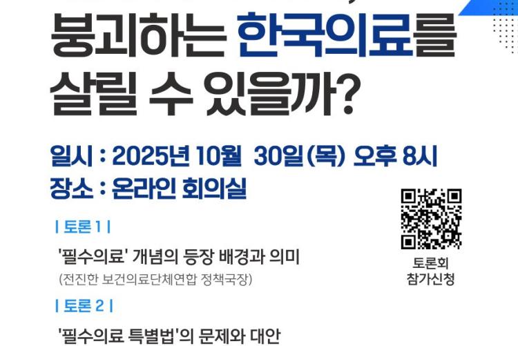 정부가 '필수의료'를 살리겠다고 나서고 있고, 국회에선 최근 ‘필수의료 특별법’이 보건복지위를 통과했습니다. 붕괴하는 한국 의료를 살리겠다는 이 ‘필수의료’ 강화 방안, 과연 그 목적을 달성할 수 있을지, 문제는 없는지 짚고 토론하고자 합니다. 회원 선생님들의 많은 참여를 바랍니다.