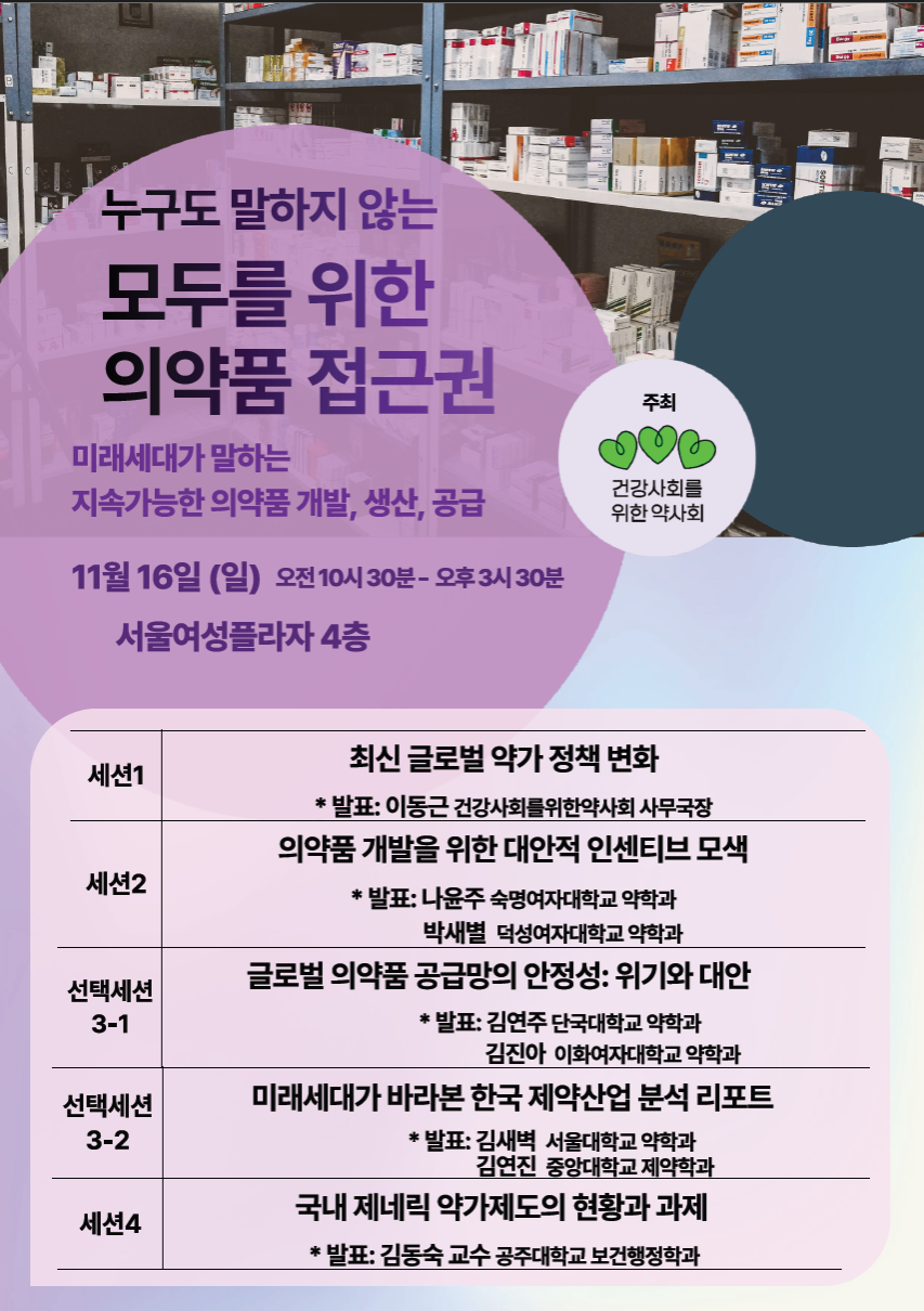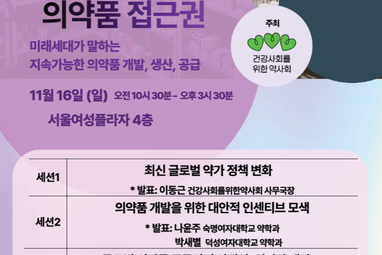 건강사회를위한약사회(이하 건약)는 지난 11월 16일 서울여성플라자에서 '모두를 위한 의약품 접근권 심포지엄'을 개최했다. 이번 심포지엄은 의약품 접근권을 개발·생산·유통·가격 결정 등 전 주기적 관점에서 조망하고, 시민사회와 미래세대가 함께 지속가능한 대안을 모색하기 위해 마련되었다. 특히 건약과 함께 의약품 접근권을 공부한 약학대학 학생들이 직접 연구·발표에 참여하여, 청년 세대의 시각에서 현 제도의 문제점과 개선방안을 제시했다.