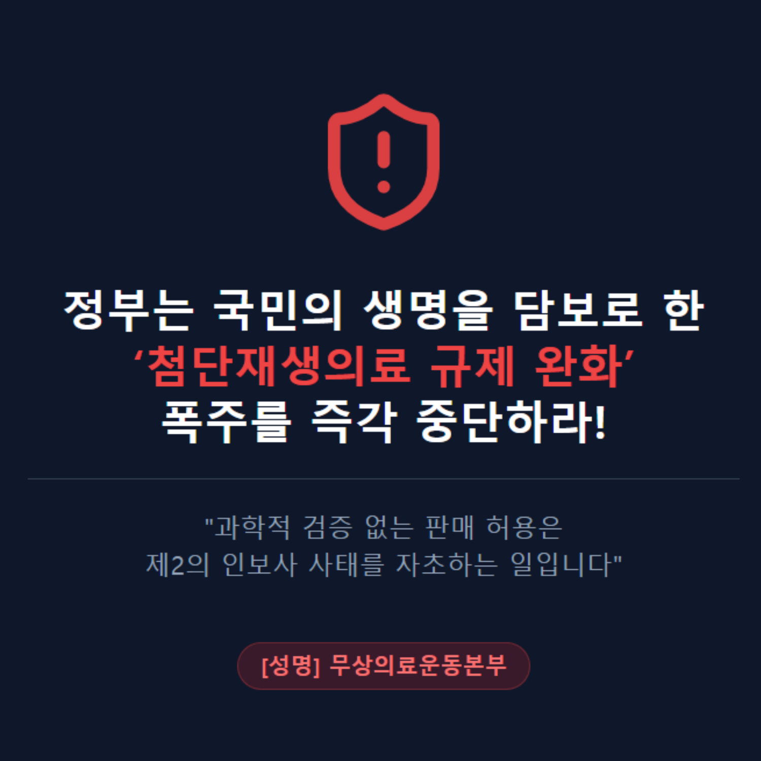 정부는 지푸라기라도 잡고 싶은 환자들을 유인해 근거가 미약한 치료를 제공하는 해외 원정치료의 위험을 앞장서 경고하기는커녕, 오히려 국내에서도 똑같이 위험한 시술을 받을 수 있게 판을 깔아주는 길을 택했다. 재생의료가 기적의 치료법인 양 포장되는 마케팅에 정부가 앞장서는 꼴이다. 우리는 이미 황우석 사태와 인보사 사태를 통해 검증되지 않은 기술이 초래하는 참혹한 결과를 목격했다. 정부는 산업계의 근시안적 이익을 쫓는 규제 완화 폭주를 멈추고, 국민의 생명권과 건강권을 최우선으로 하는 보건 정책의 본령으로 돌아오라.