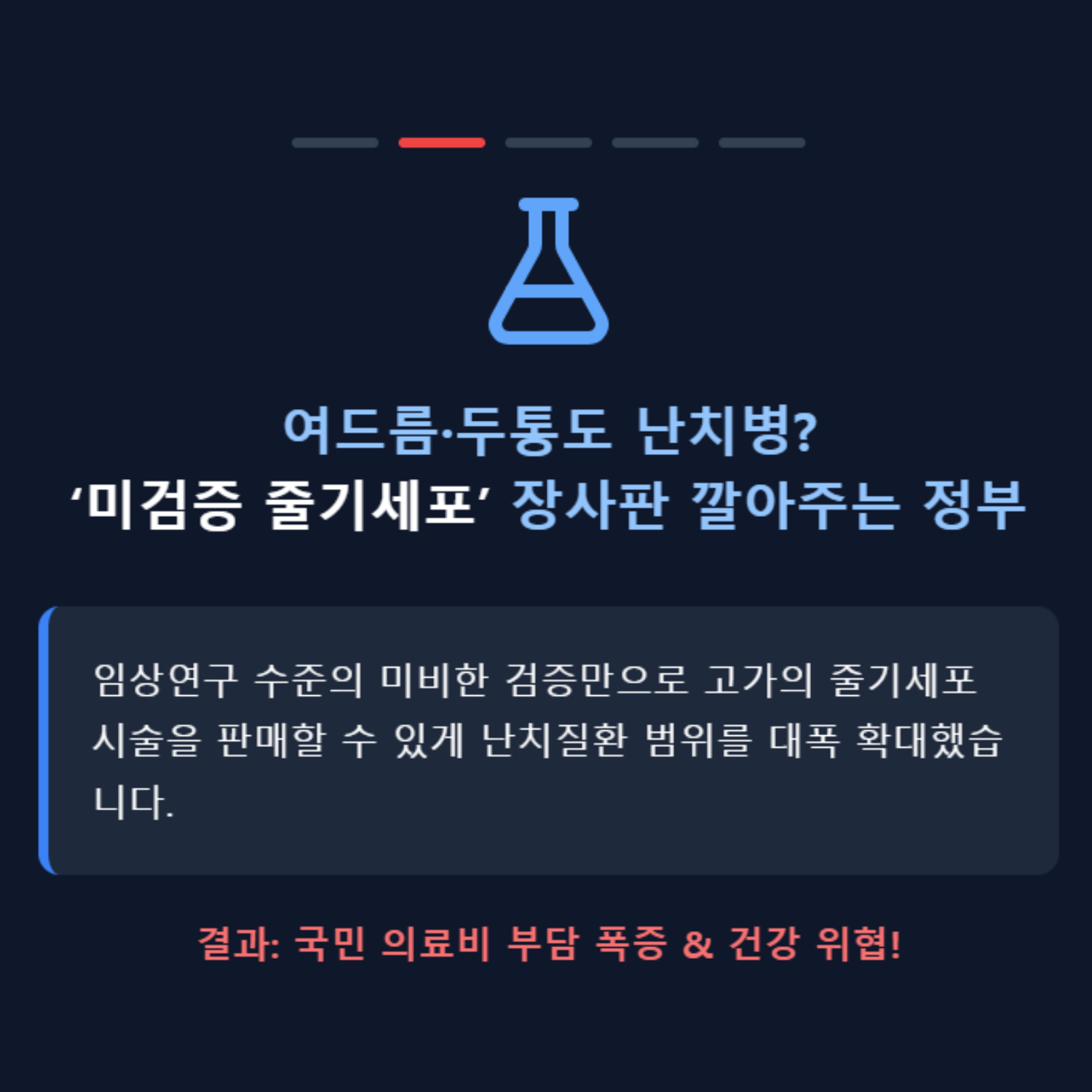 첫째, 무분별한 난치질환 기준 완화는 ‘미검증 줄기세포 치료’ 양산의 서막이다.