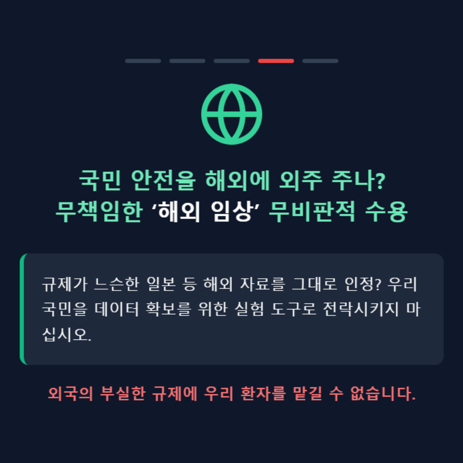 셋째, 해외 임상자료의 무비판적 수용은 국민의 안전을 외국의 규제기관에 맡기는 무책임한 처사다.
