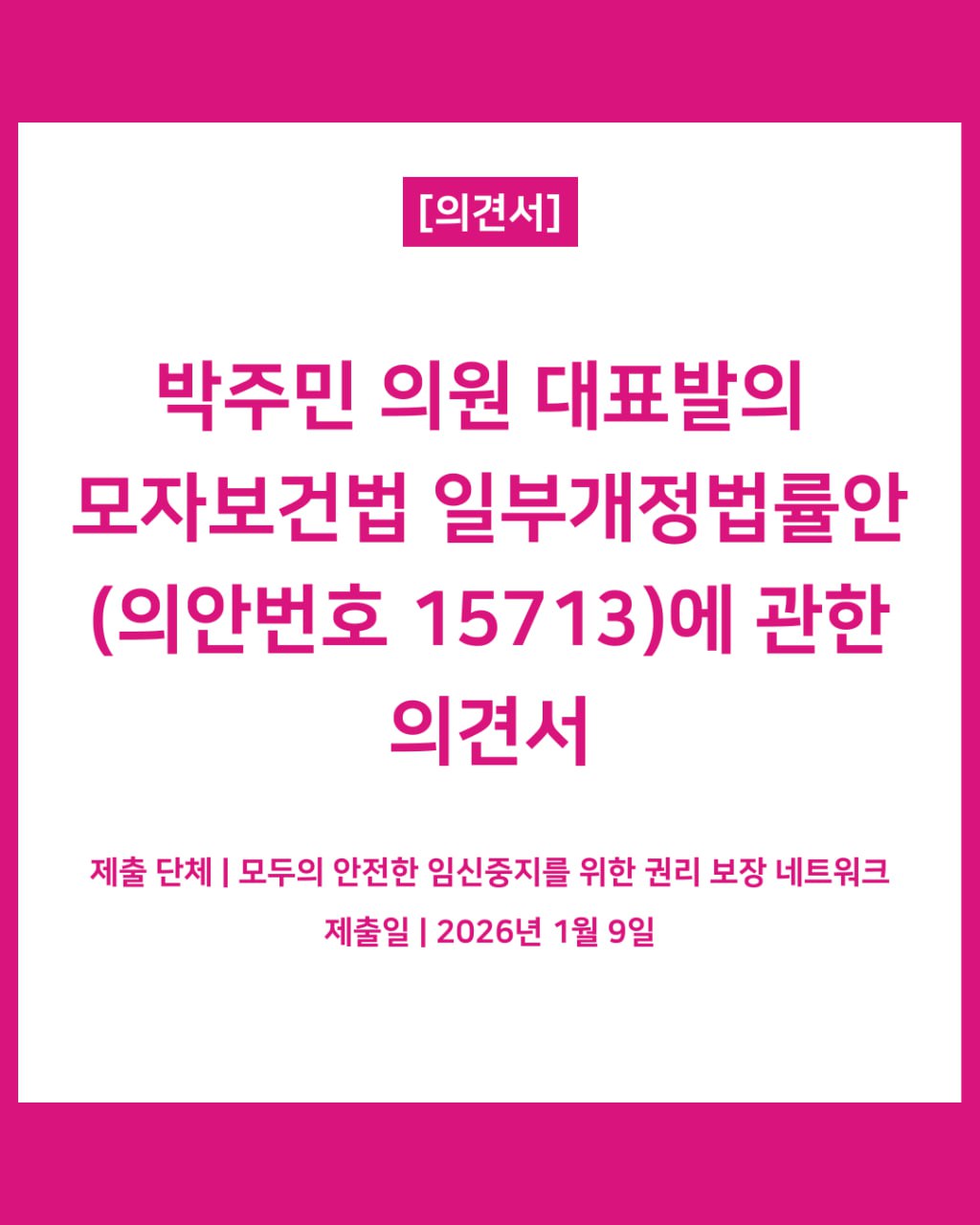 - 모임넷은 2025년 12월 30일 발의된 박주민 의원 외 11인의 모자보건법 일부개정법률안(의안번호 15713)에 관하여 각 조항에 관한 의견서를 다음과 같이 제출합니다.