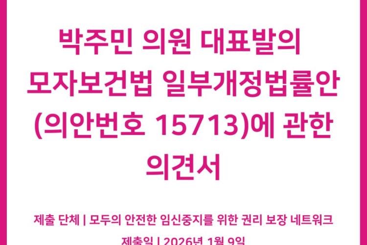- ‘모두의 안전한 임신중지를 위한 권리 보장 네트워크(이하 모임넷)’는 지난 1월 9일, 박주민 의원이 대표 발의한 「모자보건법 일부개정법률안」(의안번호 15713)에 대한 의견서를 제출했다. 모임넷은 이번 의견서를 통해 개정안이 약물에 의한 인공임신중절을 정의에 포함한 점 등은 긍정적으로 평가하나, 상담 사실 확인서 제출 의무화 등 여전히 임신중지 접근성을 저해하는 독소조항이 포함되어 있음을 지적하며 전면적인 수정을 요구했다.