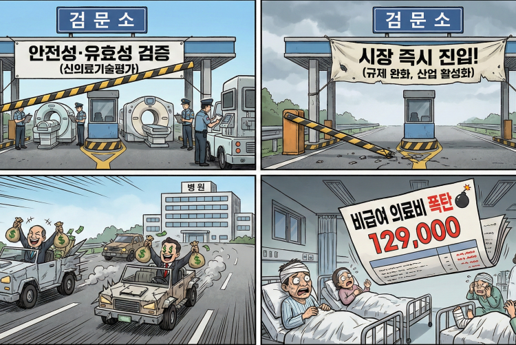 이 제도는 ‘혁신형 의료기기’를 별도의 신의료기술평가 없이 시장(의료 현장)에 즉시 진입시켜 환자에게 사용할 수 있게 하는 제도다. 이는 윤석열 내란 수괴가 2024년 9월 공청회를 거쳐 지난해 5월에 입법예고한 것이다. 당시 윤석열은 안전성과 효과성을 검증하는 필수 제도인 ‘신의료기술평가제도’를 ‘킬러 규제’라며 공격해댔고, 그 결과 나온 것이 바로 ‘시장 즉시진입 의료기술 제도’다. 이재명 민주당 정부는 윤석열 정부의 것을 그대로 수용해 오늘부터 시행하는 것이다.