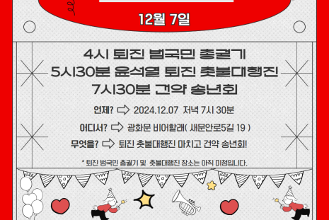 이번 송년회는 광화문에서 열리는 집회 참여를 겸해서 광화문역에서 진행하려 합니다. 많은 회원들이 윤석열정권퇴진집회에 함께하고 뒤풀이 차원에서 광화문역 근처 호프집에서 열리는 건약 송년회에도 함께 해주시세요.