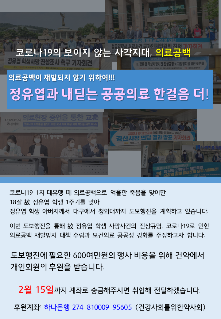 ※ 코로나19 1차 대유행때 의료공백으로 억울한 18살 고 정유엽 학생 1주기에 맞춰 정유엽학생 아버님과 함께 도보행진을 준비하고 있습니다.