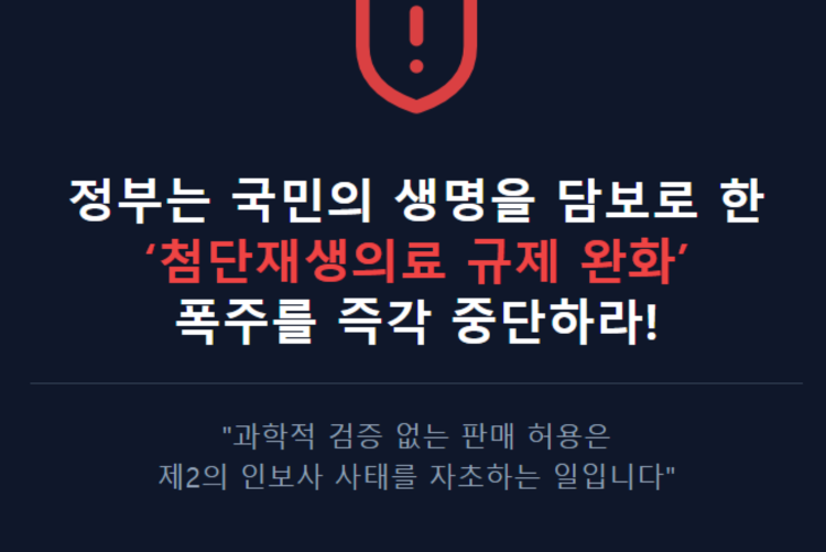 정부는 지푸라기라도 잡고 싶은 환자들을 유인해 근거가 미약한 치료를 제공하는 해외 원정치료의 위험을 앞장서 경고하기는커녕, 오히려 국내에서도 똑같이 위험한 시술을 받을 수 있게 판을 깔아주는 길을 택했다. 재생의료가 기적의 치료법인 양 포장되는 마케팅에 정부가 앞장서는 꼴이다. 우리는 이미 황우석 사태와 인보사 사태를 통해 검증되지 않은 기술이 초래하는 참혹한 결과를 목격했다. 정부는 산업계의 근시안적 이익을 쫓는 규제 완화 폭주를 멈추고, 국민의 생명권과 건강권을 최우선으로 하는 보건 정책의 본령으로 돌아오라.