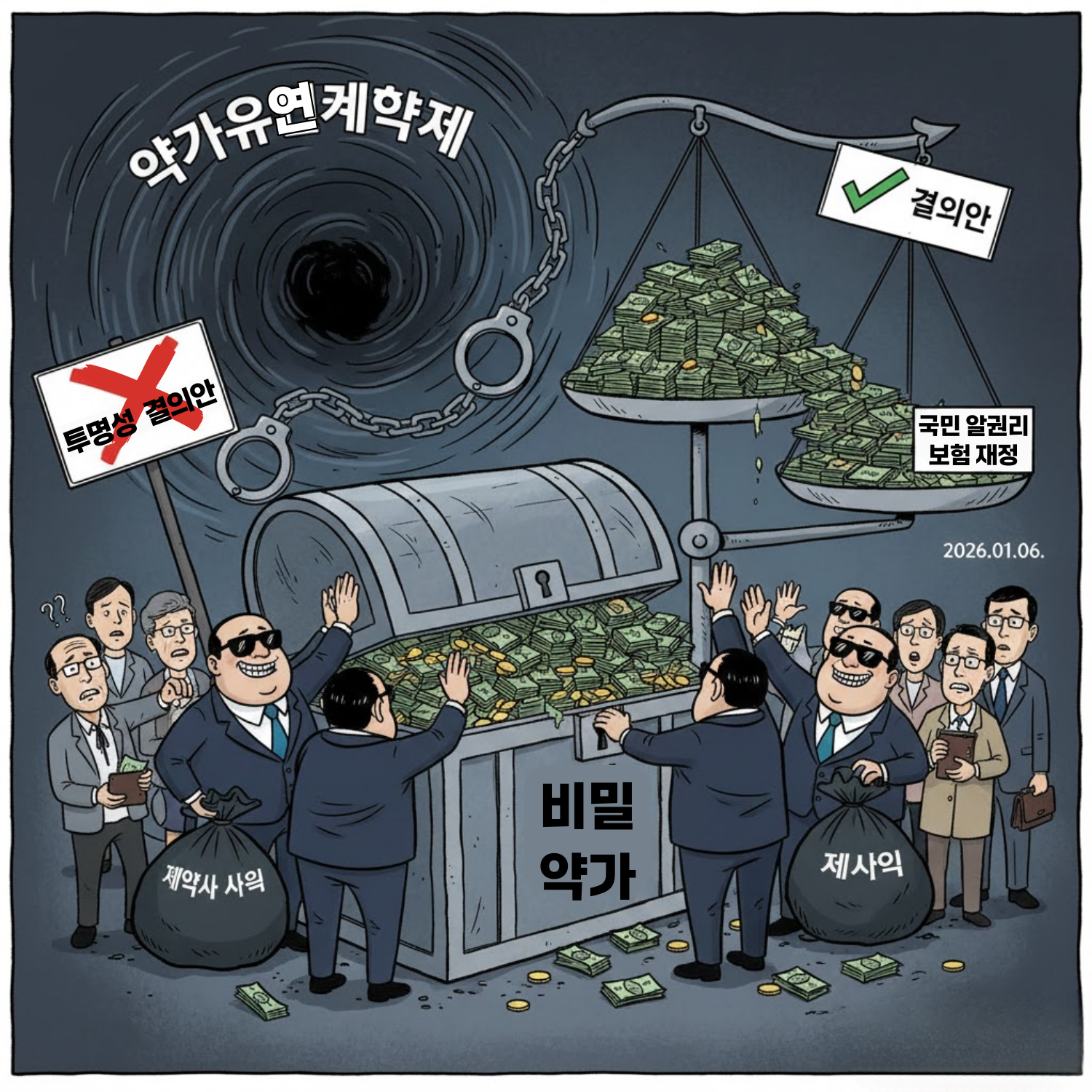 정부는 지금이라도 얄팍한 제약사의 사익이 아닌 국민의 알 권리와 건강보험의 지속가능성을 우선해야 한다. 보건복지부는 투명성을 훼손하는 약가유연계약제 확대 시도를 즉각 중단하고, 약가 결정 과정의 공정성을 확보할 수 있는 근본적인 대책을 마련해야 한다.