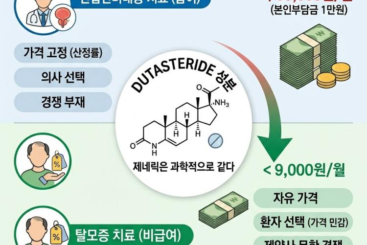 이유는 간단하다. 제약사가 탈모치료제 시장에서 '가격을 자유롭게 결정하기 위해서'다. 보통 비급여라고 하면 '비싼 약'을 상상하기 쉽지만, 두타스테리드 시장은 정반대로 작동한다. 제약사들은 전립선비대증 처방용보다 가격을 절반 이하로 낮추는 전략을 취하고 있다.