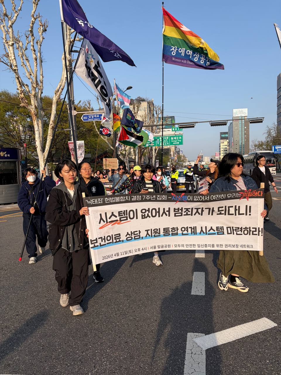 낙태죄가 폐지되어도 살인죄로 처벌 받는 작금의 현실을 보면서, 성차별적 세상에서 법의 본질은 약자들을 처벌하는 것에 있는지 되물어보게 됩니다. 3월 4일, 서울중앙지법은 후기 임신중지를 이유로 살인죄로 기소된 여성에게 징역 3년과 집행유예 5년을 선고했습니다. 임신중지 수술 사실이 당사자의 SNS를 통해 퍼지면서 논란이 되자 보건복지부가 수사 의뢰를 한 것입니다. 임신중지가 절실한 여성에게 자원과 안전한 환경을 제공해야 할 복지부가 먼저 살인죄 수사의뢰를 했다는 사실이 믿기지 않을만큼 분노스럽습니다. 세계의 극우 세력들이 임신중지를 포함해 성적, 재생산권을 파괴하려는 정세에서, 여기 모인 우리는 내란 수괴를 몰아내고 약자들의 권리가 신장된, 차별 없는 평등한 세상에 대한 희망을 보여줬습니다. 그 투쟁으로 탄생할 수 있었던 정부는 공백을 채우려는 노력 없이, 또다시 임신중절을 이유로 살인죄를 적용하여 처벌하려는 성차별적 관행을 따르고 있습니다.